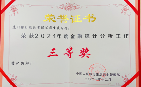 重慶分行榮獲2021年金融統(tǒng)計(jì)分析工作三等獎(jiǎng)