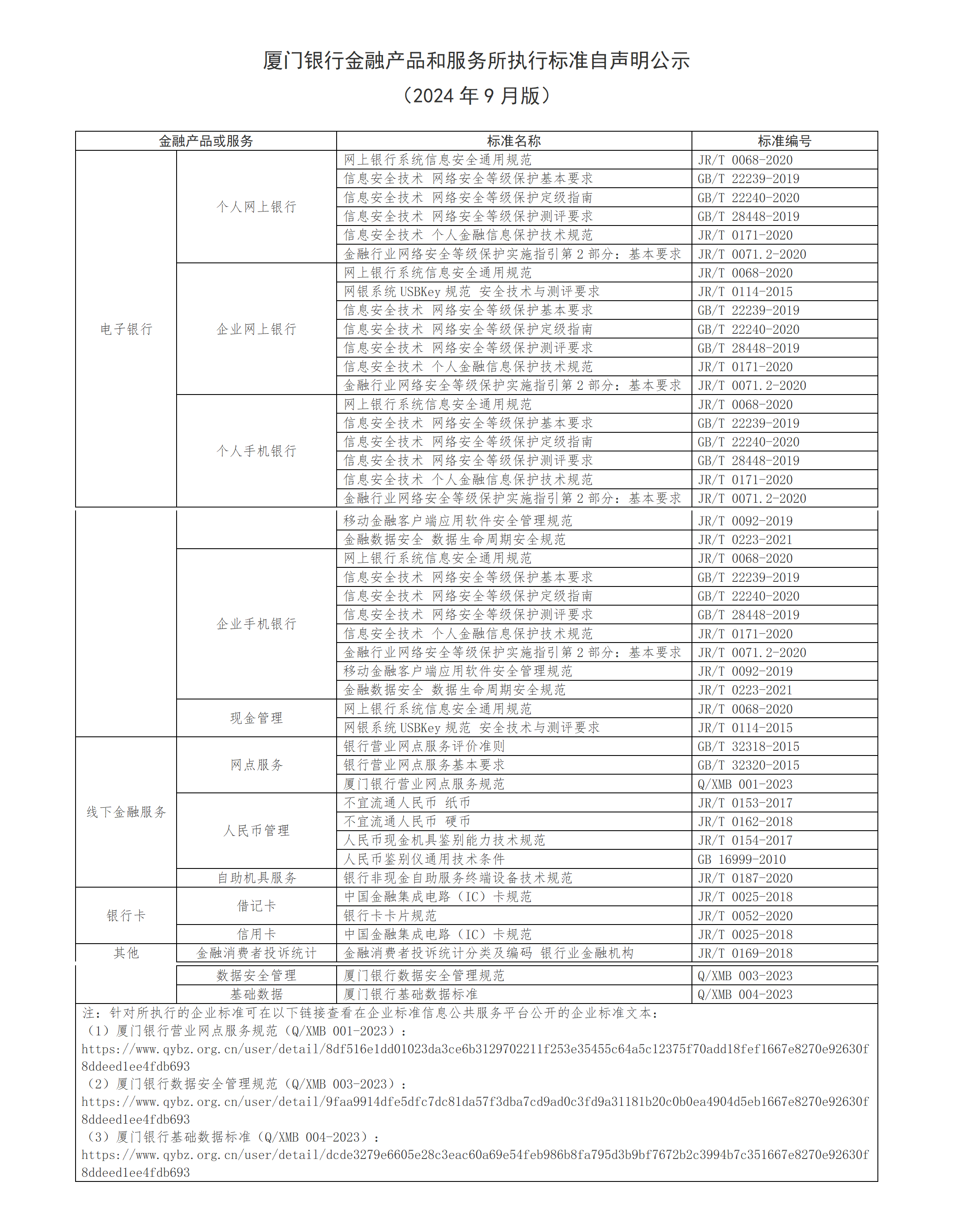 廈門銀行金融產(chǎn)品和服務(wù)所執(zhí)行標(biāo)準(zhǔn)自聲明公示(2024年9月)