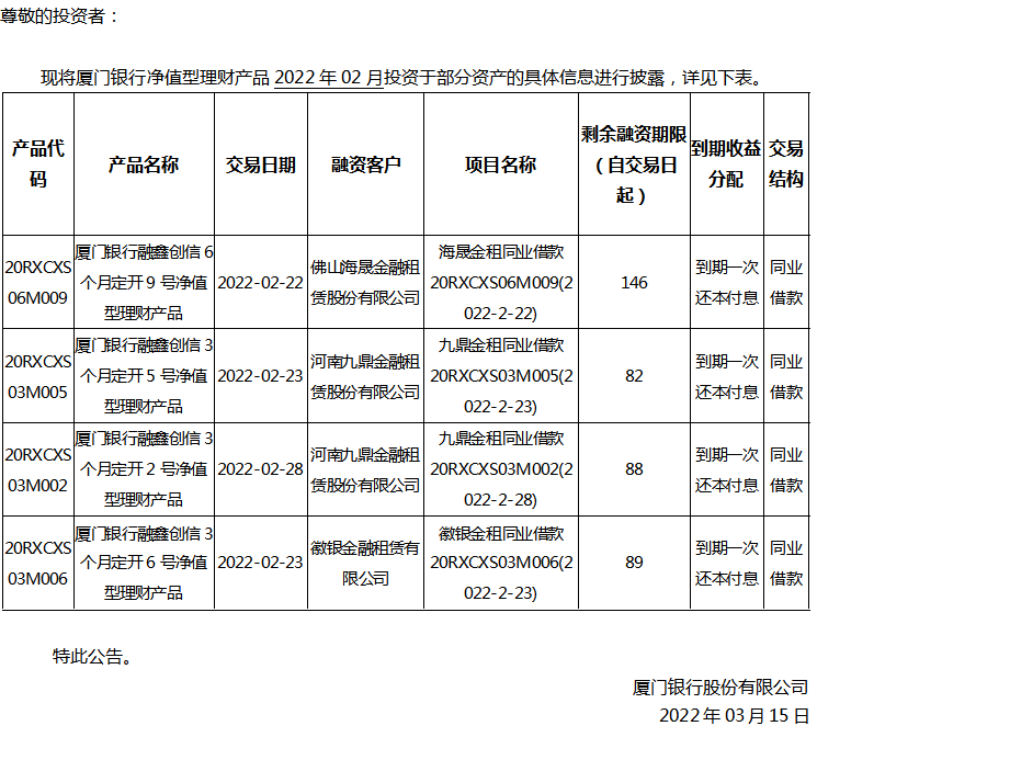 關(guān)于廈門(mén)銀行凈值型理財(cái)產(chǎn)品2022年02月投資部分資產(chǎn)的公告