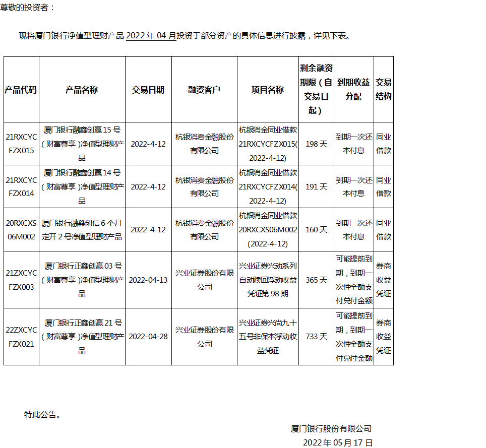 關(guān)于廈門銀行凈值型理財產(chǎn)品2022年04月投資部分資產(chǎn)的公告