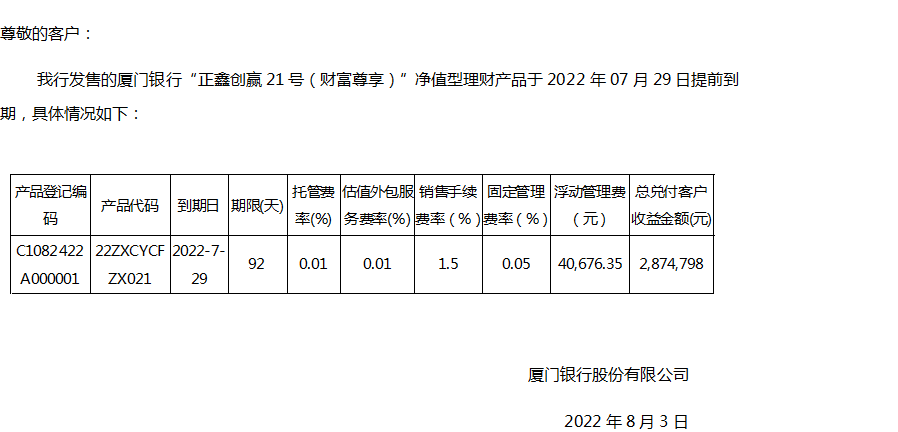 廈門銀行“正鑫創(chuàng)贏21號(財富尊享)”凈值型理財產(chǎn)品到期公告