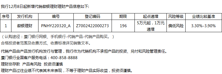 廈門銀行12月8日代銷徽銀理財理財產(chǎn)品信息