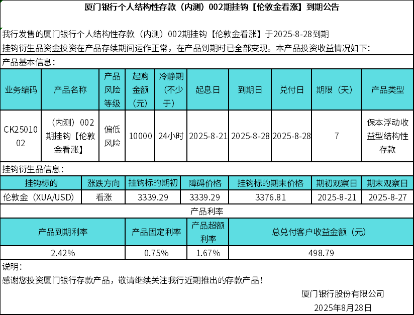 廈門銀行個(gè)人結(jié)構(gòu)性存款(內(nèi)測(cè))002期掛鉤【倫敦金看漲】到期公告