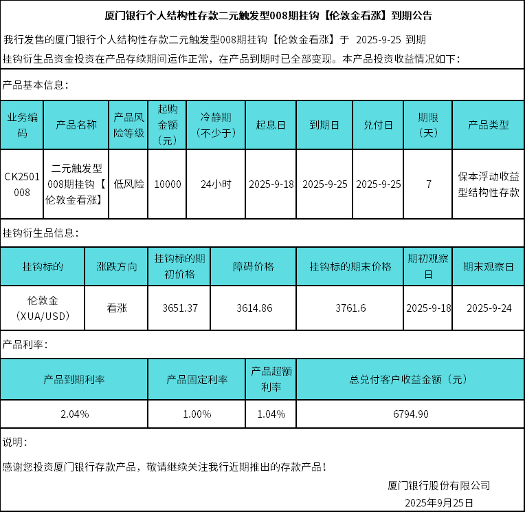 廈門銀行個人結構性存款二元觸發(fā)型008期掛鉤【倫敦金看漲】到期公告