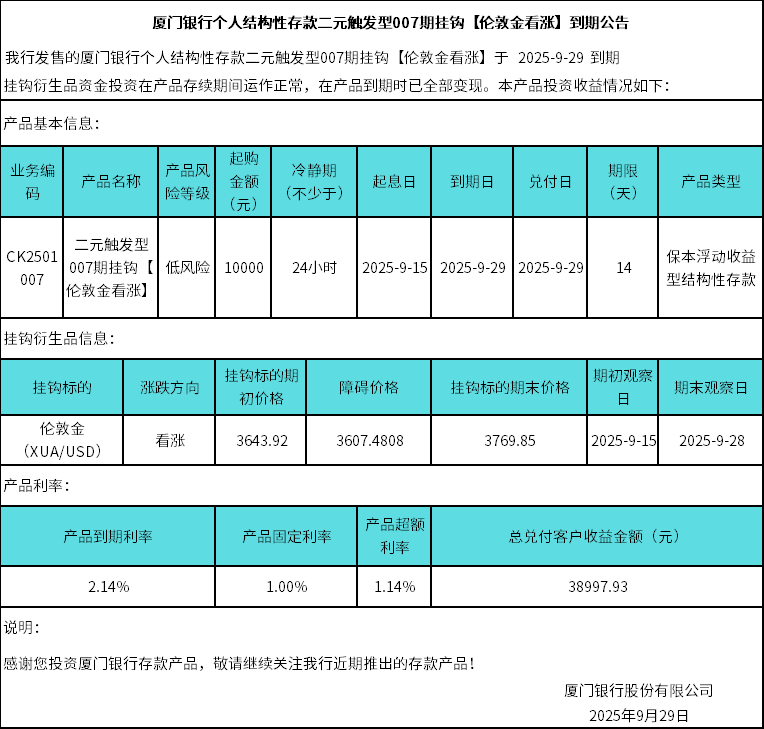 廈門銀行個(gè)人結(jié)構(gòu)性存款二元觸發(fā)型007期掛鉤【倫敦金看漲】到期公告