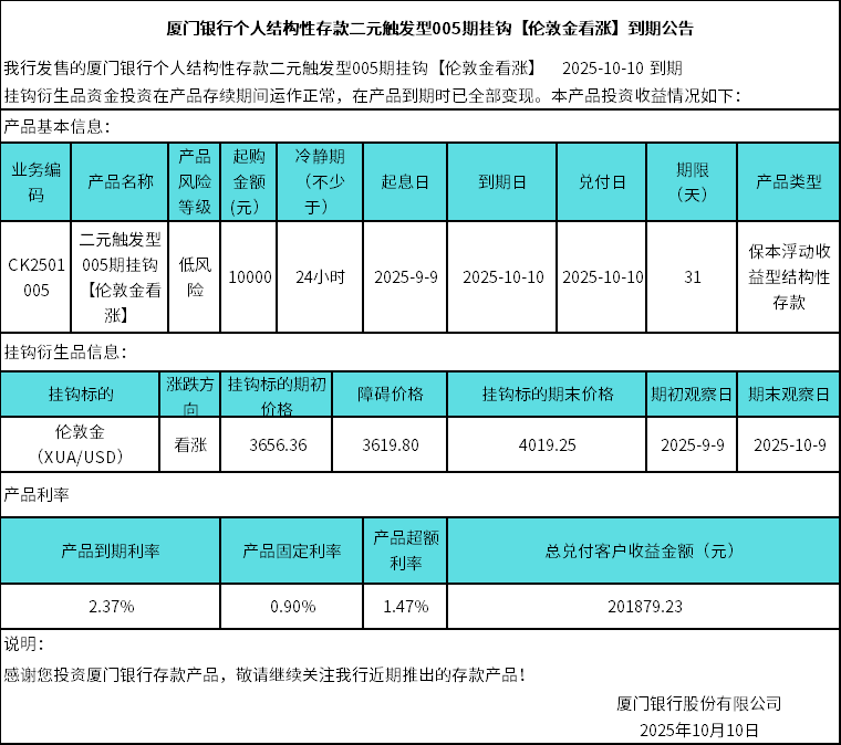 廈門銀行個人結構性存款二元觸發(fā)型005期掛鉤【倫敦金看漲】到期公告