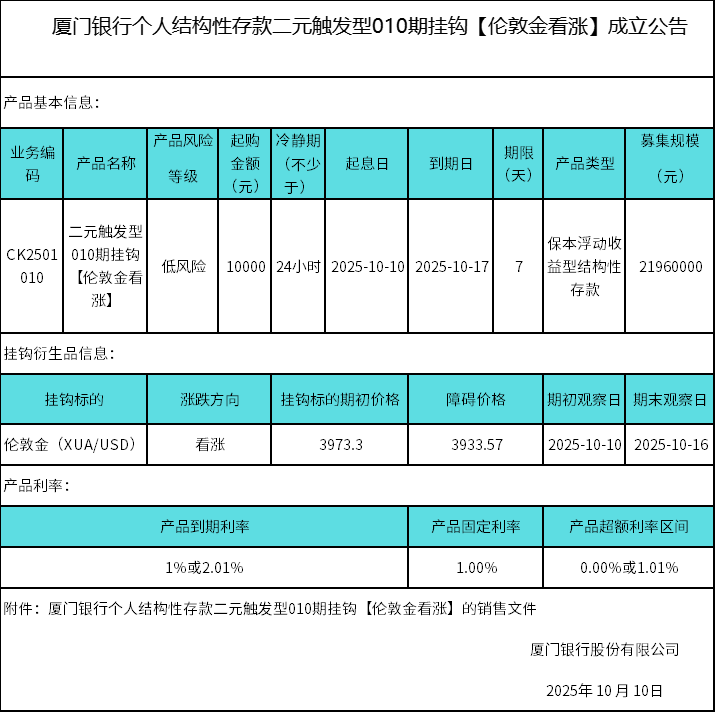 廈門銀行個人結(jié)構(gòu)性存款二元觸發(fā)型010期掛鉤【倫敦金看漲】成立公告 日期:2025-10-10 17:31:28 廈門銀行個人結(jié)構(gòu)性存款二元觸發(fā)型010期掛鉤【倫敦金看漲】銷售文件.zip 返回 下一篇