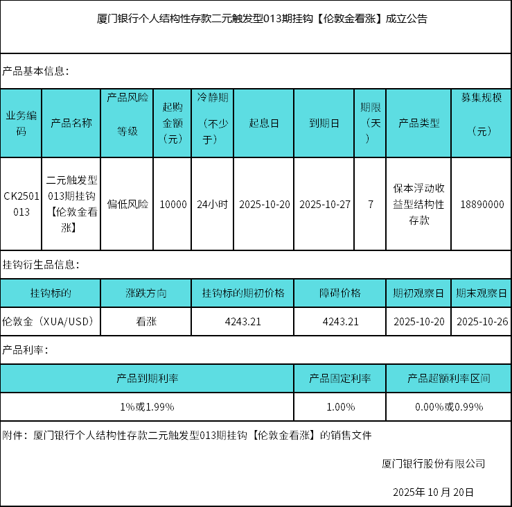 廈門銀行個(gè)人結(jié)構(gòu)性存款二元觸發(fā)型013期掛鉤【倫敦金看漲】成立公告 日期:2025-10-20 16:23:01 廈門銀行個(gè)人結(jié)構(gòu)性存款二元觸發(fā)型013期掛鉤【倫敦金看漲】銷售文件.zip 返回 下一篇