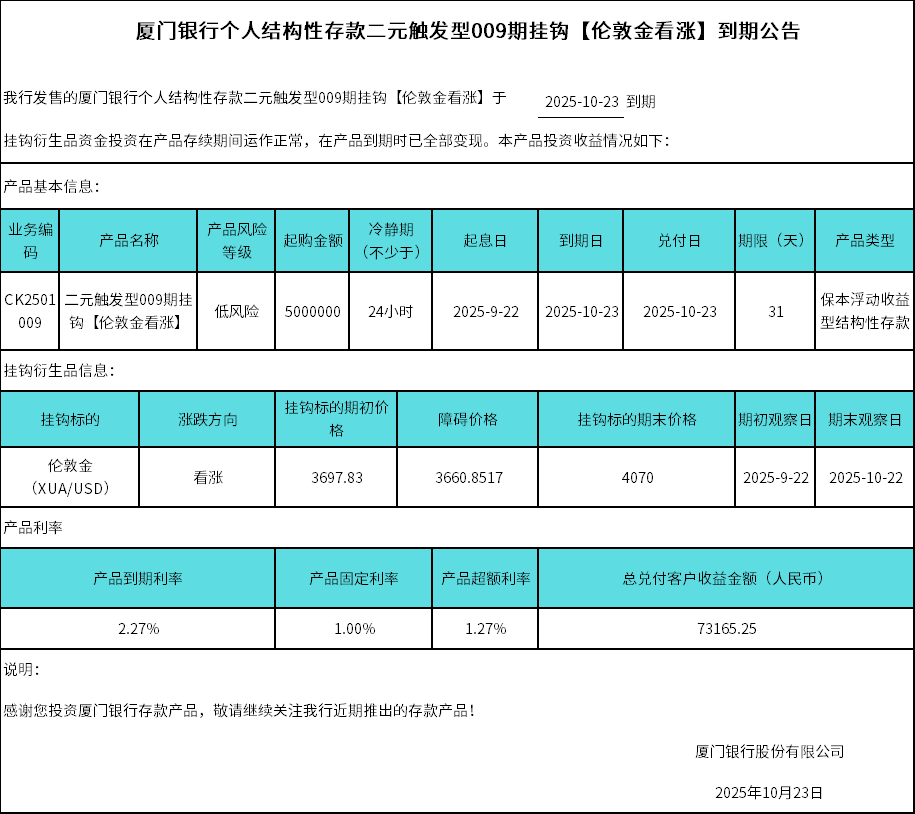 廈門銀行個人結構性存款二元觸發(fā)型009期掛鉤【倫敦金看漲】到期公告