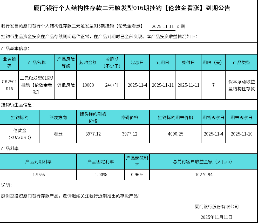 廈門銀行個人結(jié)構性存款二元觸發(fā)型016期掛鉤【倫敦金看漲】到期公告