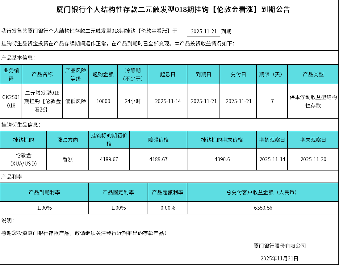 廈門銀行個人結(jié)構(gòu)性存款二元觸發(fā)型018期掛鉤【倫敦金看漲】到期公告