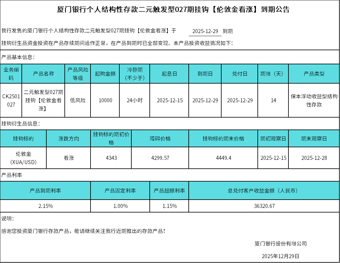 廈門銀行個人結(jié)構(gòu)性存款二元觸發(fā)型027期掛鉤【倫敦金看漲】到期公告