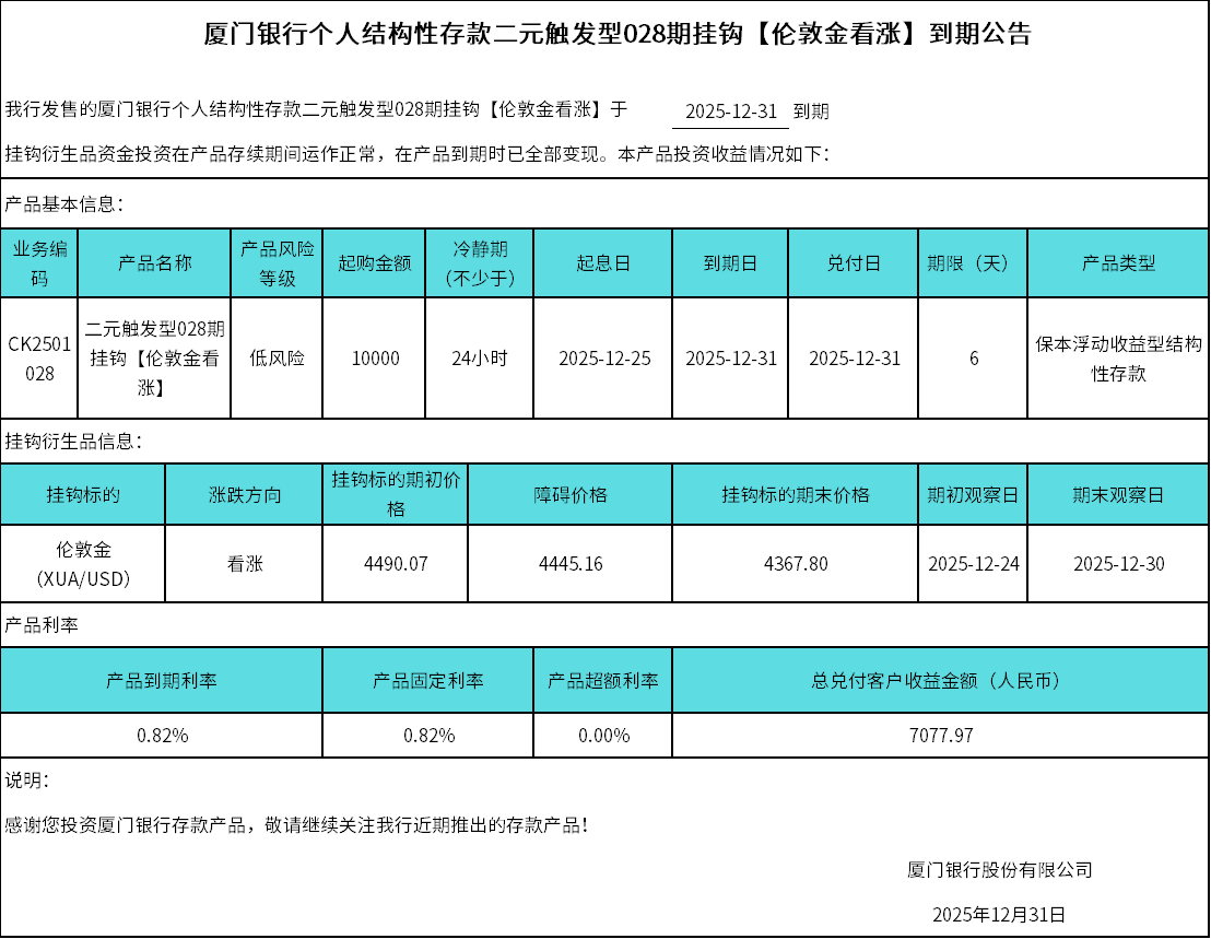 廈門銀行個(gè)人結(jié)構(gòu)性存款二元觸發(fā)型028期掛鉤【倫敦金看漲】到期公告