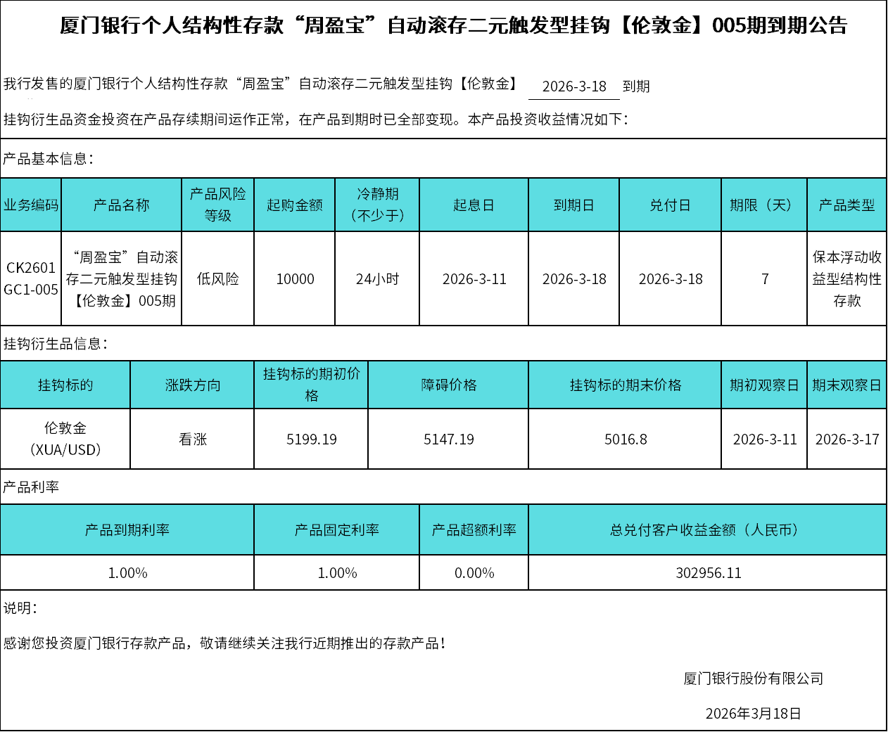 廈門(mén)銀行個(gè)人結(jié)構(gòu)性存款“周盈寶”自動(dòng)滾存二元觸發(fā)型掛鉤【倫敦金】005期到期公告 日期:2026-03-19 09:54:16 上一篇 返回 下一篇