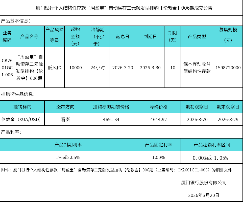 廈門銀行個人結(jié)構(gòu)性存款“周盈寶”自動滾存二元觸發(fā)型掛鉤【倫敦金】006期成立公告 日期:2026-03-20 15:33:24 廈門銀行個人結(jié)構(gòu)性存款二元觸發(fā)型CK2601GC1-006期掛鉤【倫敦金看漲】銷售文件.zip 返回 下一篇