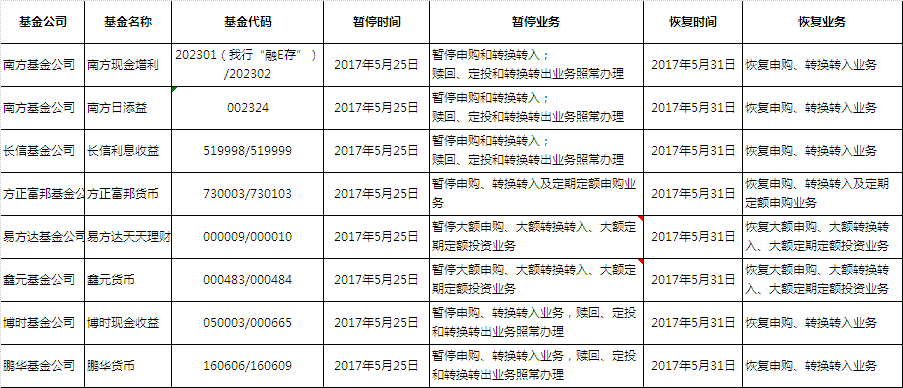 1、2017年5月25日至5月30日,根據(jù)各基金公司安排為保護基金份額持有人權(quán)益貨幣型基金業(yè)務(wù)將暫停,2017年5月31日,各項業(yè)務(wù)將恢復(fù)正常,屆時不再公告,最終以基金公司發(fā)布公告為準(zhǔn)。