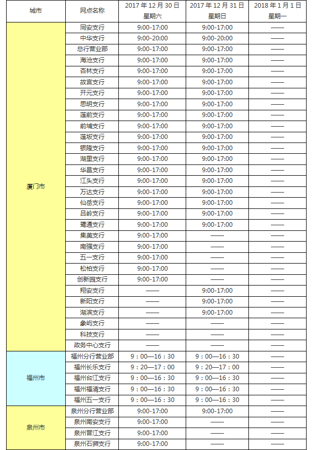 廈門銀行2018年元旦假期網(wǎng)點(diǎn)營(yíng)業(yè)時(shí)間通告