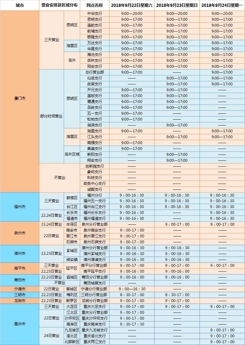廈門銀行2018年中秋節(jié)假期網(wǎng)點(diǎn)營業(yè)時(shí)間通告