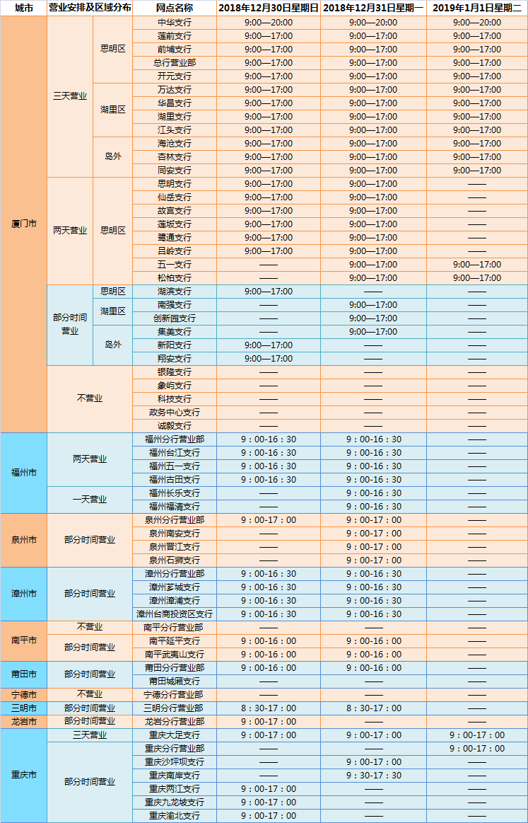 廈門銀行2019年元旦假期網(wǎng)點(diǎn)營業(yè)時(shí)間通告