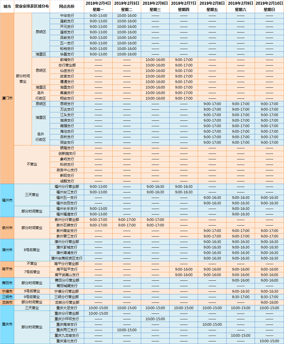 廈門銀行2019年春節(jié)假期網(wǎng)點(diǎn)營業(yè)時(shí)間通告