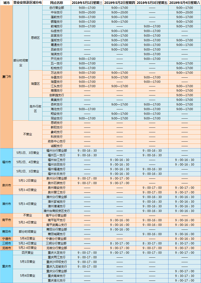 廈門銀行2019年勞動(dòng)節(jié)假期網(wǎng)點(diǎn)營業(yè)時(shí)間通告