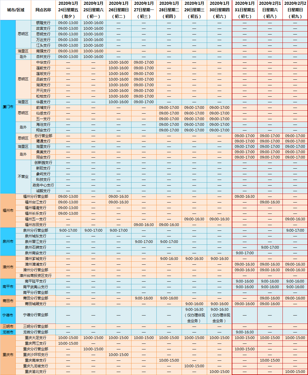 廈門銀行2020年春節(jié)放假期間營業(yè)網(wǎng)點調(diào)整