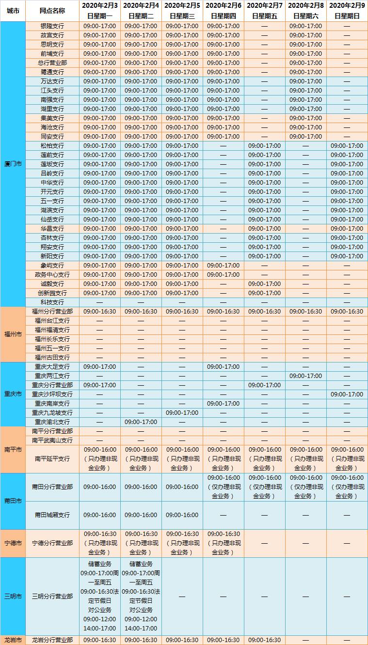 廈門(mén)銀行2020年延遲復(fù)工期間(2月3日-9日)網(wǎng)點(diǎn)營(yíng)業(yè)情況的通知