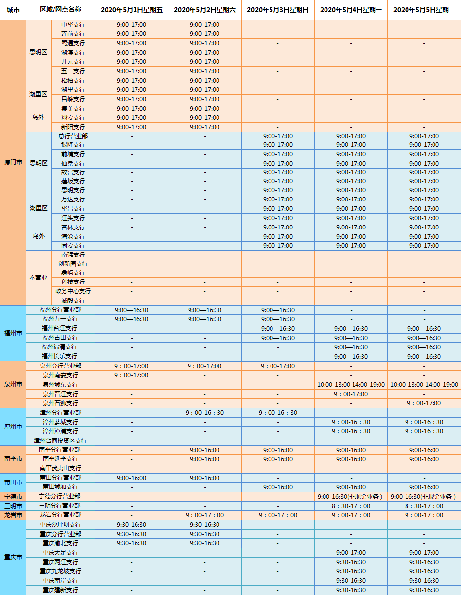 廈門銀行2020年勞動(dòng)節(jié)假期網(wǎng)點(diǎn)對(duì)外營(yíng)業(yè)時(shí)間通告