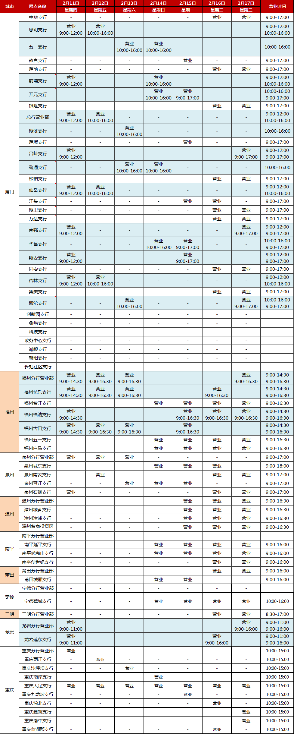 廈門(mén)銀行2021年春節(jié)假期網(wǎng)點(diǎn)對(duì)外營(yíng)業(yè)時(shí)間通告