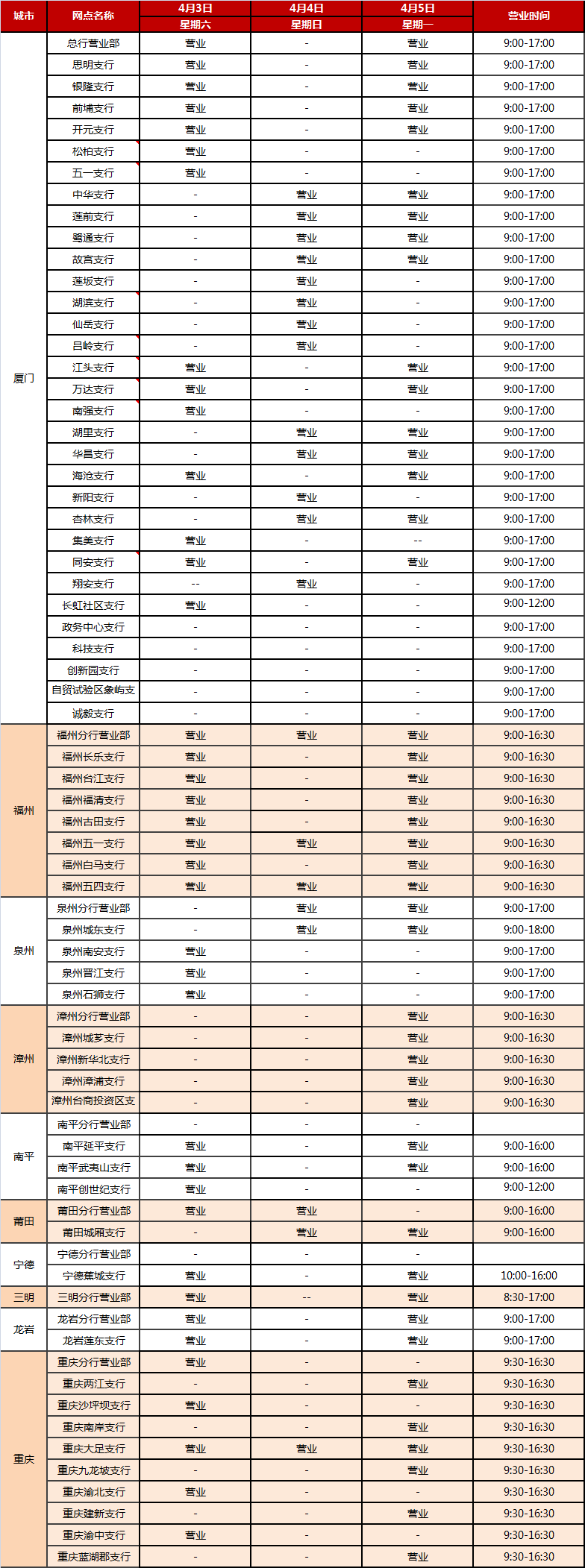 廈門銀行2021年清明節(jié)假期網(wǎng)點對外營業(yè)時間通告