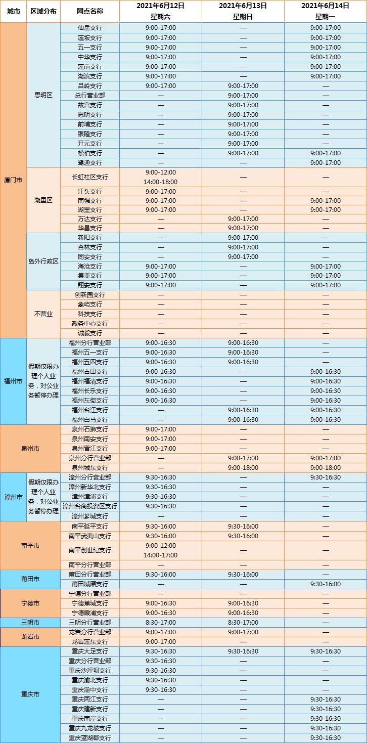 廈門銀行2021年端午節(jié)假期網(wǎng)點對外營業(yè)時間通告