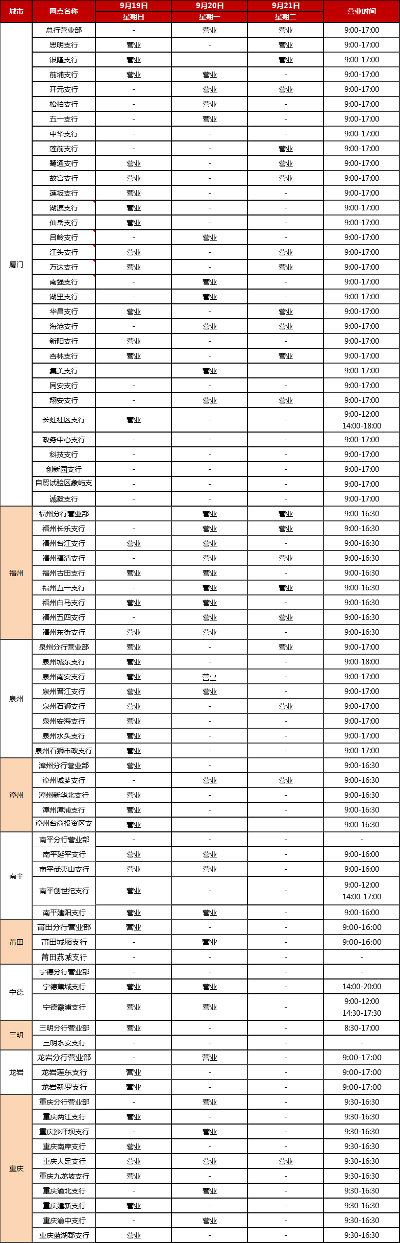 廈門銀行2021年中秋節(jié)假期網(wǎng)點(diǎn)對外營業(yè)時間通告