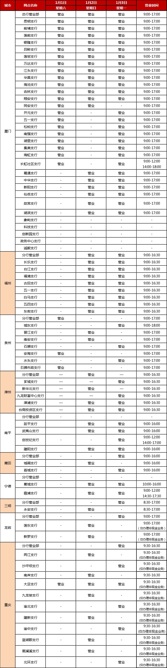 廈門銀行2022年元旦假期網(wǎng)點(diǎn)對(duì)外營(yíng)業(yè)時(shí)間通告