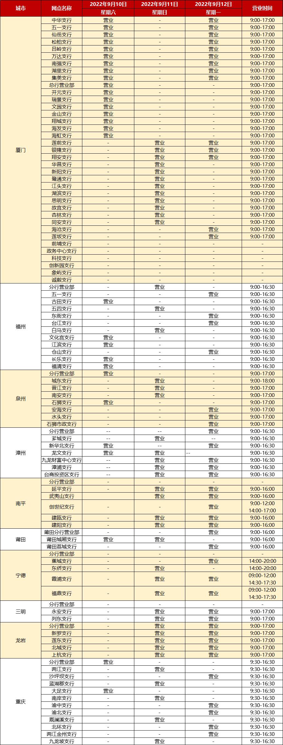 廈門(mén)銀行2022中秋節(jié)假期網(wǎng)點(diǎn)對(duì)外營(yíng)業(yè)時(shí)間通告