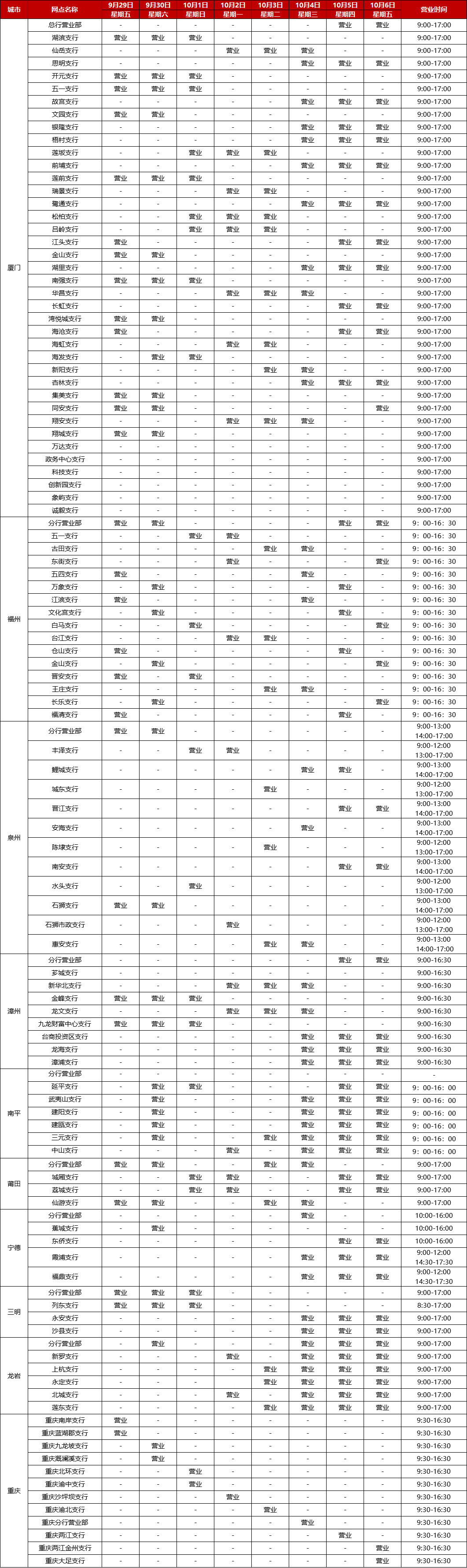 廈門銀行2023年中秋節(jié)、國慶節(jié)假期網(wǎng)點(diǎn)對外營業(yè)時(shí)間通告