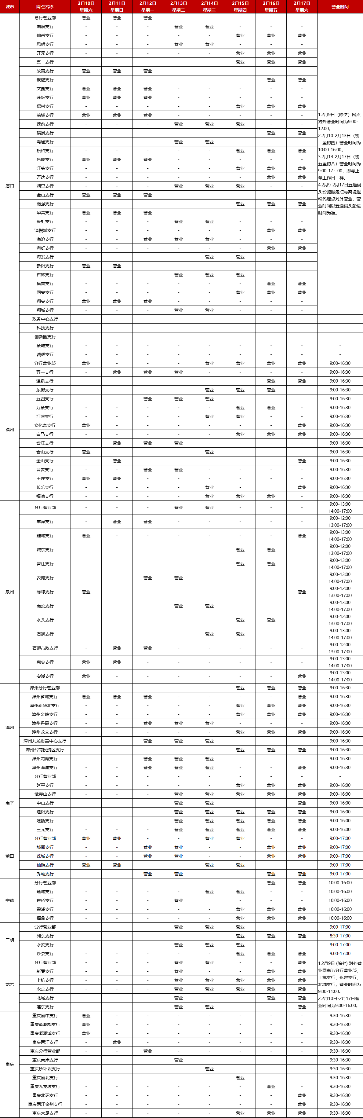 廈門銀行2024年春節(jié)假期網(wǎng)點對外營業(yè)時間通告