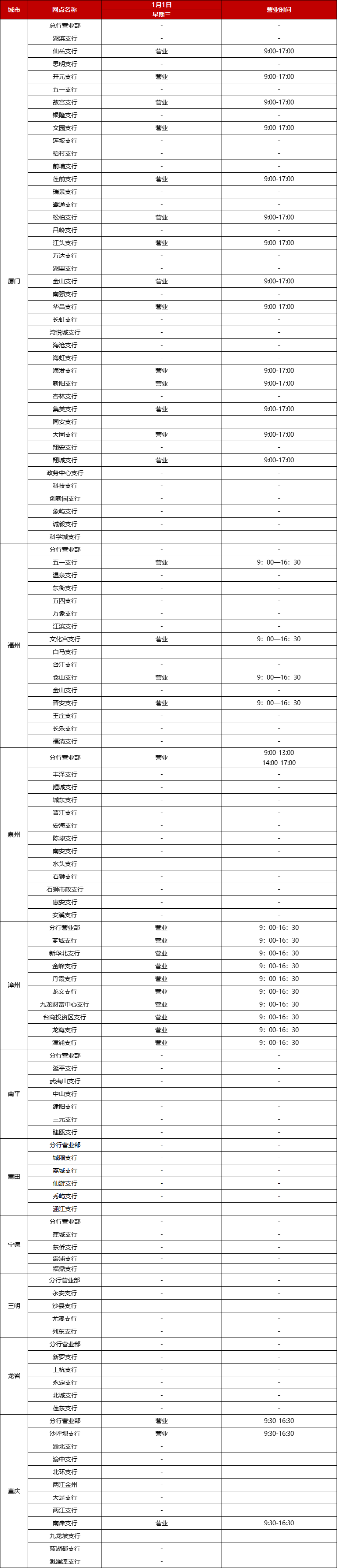 廈門銀行2025年元旦假期網(wǎng)點對外營業(yè)時間通告