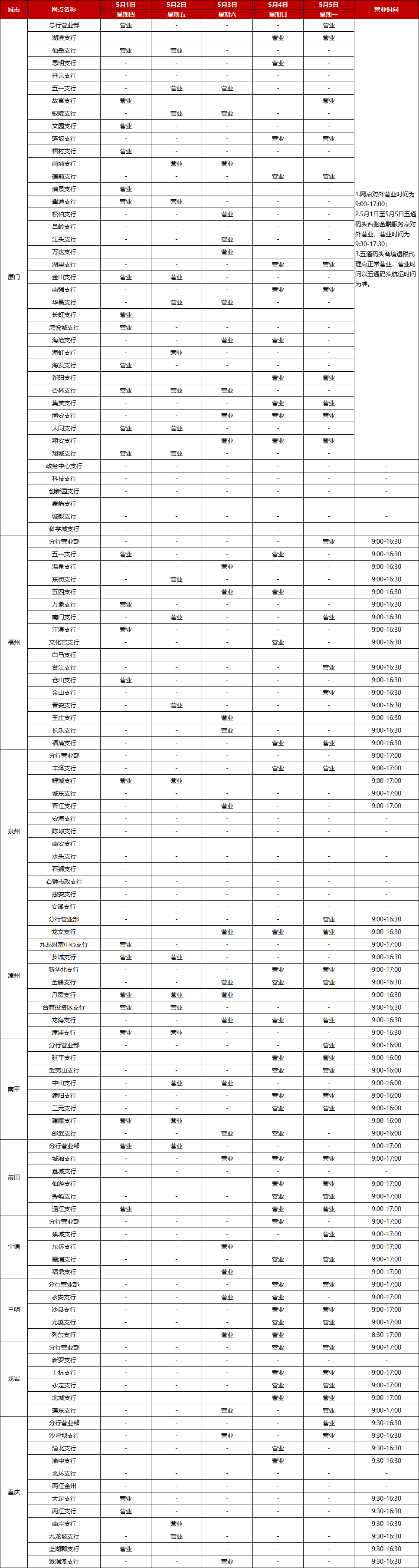 廈門銀行2025年勞動節(jié)假期網(wǎng)點對外營業(yè)時間通告