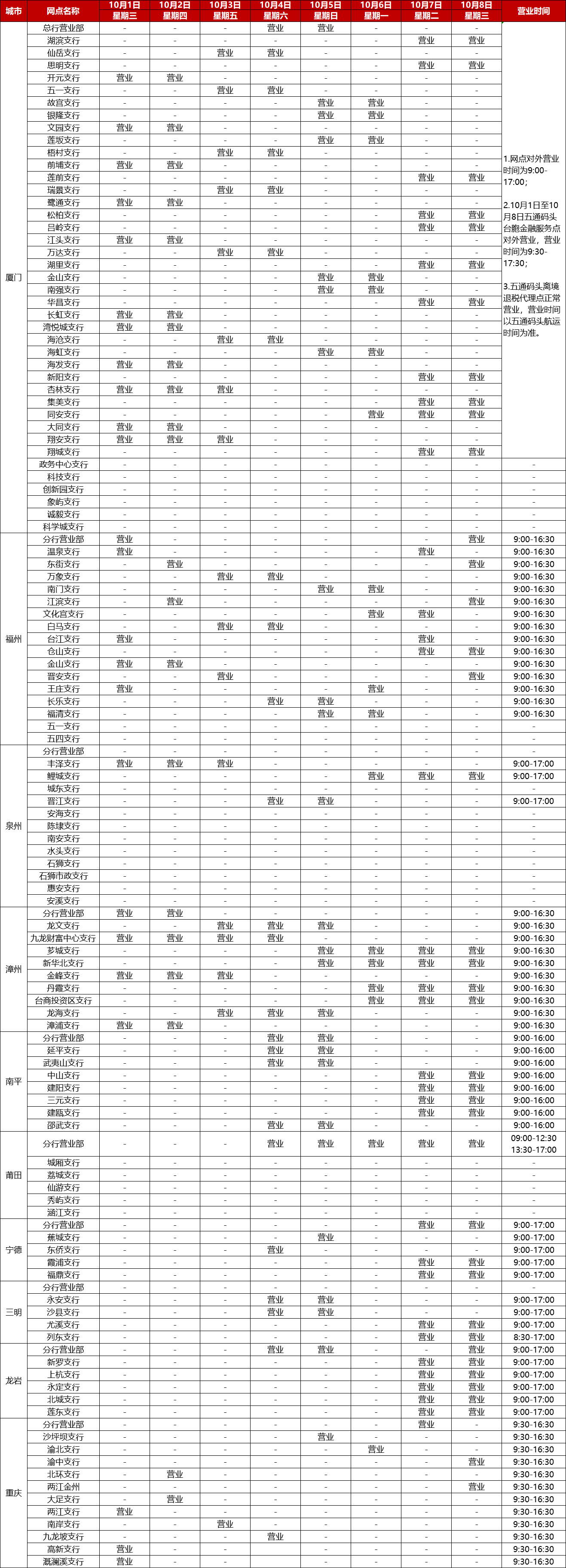 廈門銀行2025年國慶中秋節(jié)假期網(wǎng)點對外營業(yè)時間通告