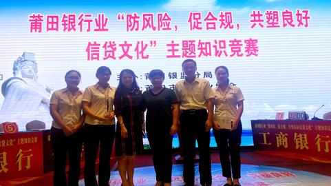 2017年9月28日,莆田分行參加由莆田市銀監(jiān)分局主辦,莆田市銀行業(yè)協(xié)會、莆田市金融團工委協(xié)辦的“防風(fēng)險 促合規(guī) 共塑良好信貸文化” 主題知識競賽決賽。分行代表隊表現(xiàn)優(yōu)異,榮獲團體三等獎的好成績。主辦方還對初賽筆試的個人前五名進行了頒獎,分行綜合管理部林揚華獲得個人優(yōu)勝獎。