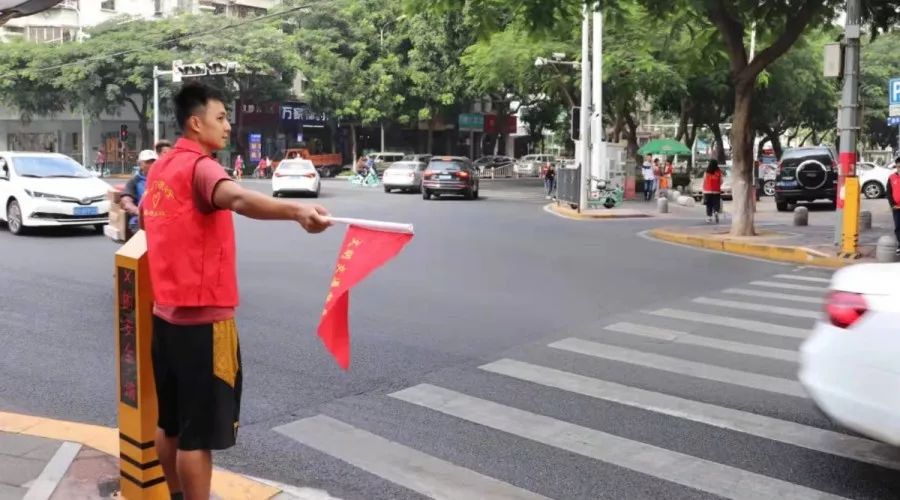志愿者進(jìn)行禮讓行人的交通督導(dǎo),倡導(dǎo)文明出行。
