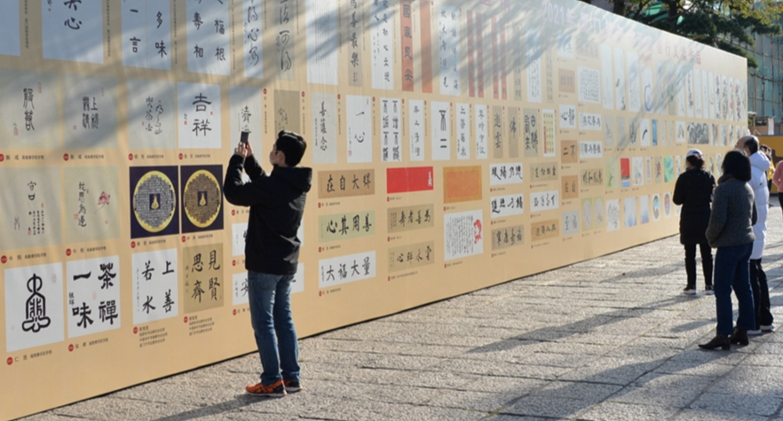 在南普陀寺廣場(chǎng)上,430幅來(lái)自廈門(mén)佛教界、市書(shū)法家協(xié)會(huì)、省以上書(shū)畫(huà)藝術(shù)家以及全國(guó)大德名家的作品,在廣場(chǎng)的巨幅展布上錯(cuò)落有致地陳列著,其中書(shū)法作品339幅,美術(shù)作品91幅,氣勢(shì)恢宏,引得市民游客紛紛駐足觀賞。當(dāng)天的書(shū)畫(huà)義賣(mài)環(huán)節(jié),有慕名而來(lái)的香客,有不期而遇的游客,大家慷慨解囊,紛紛獻(xiàn)出自己的一份愛(ài)心。