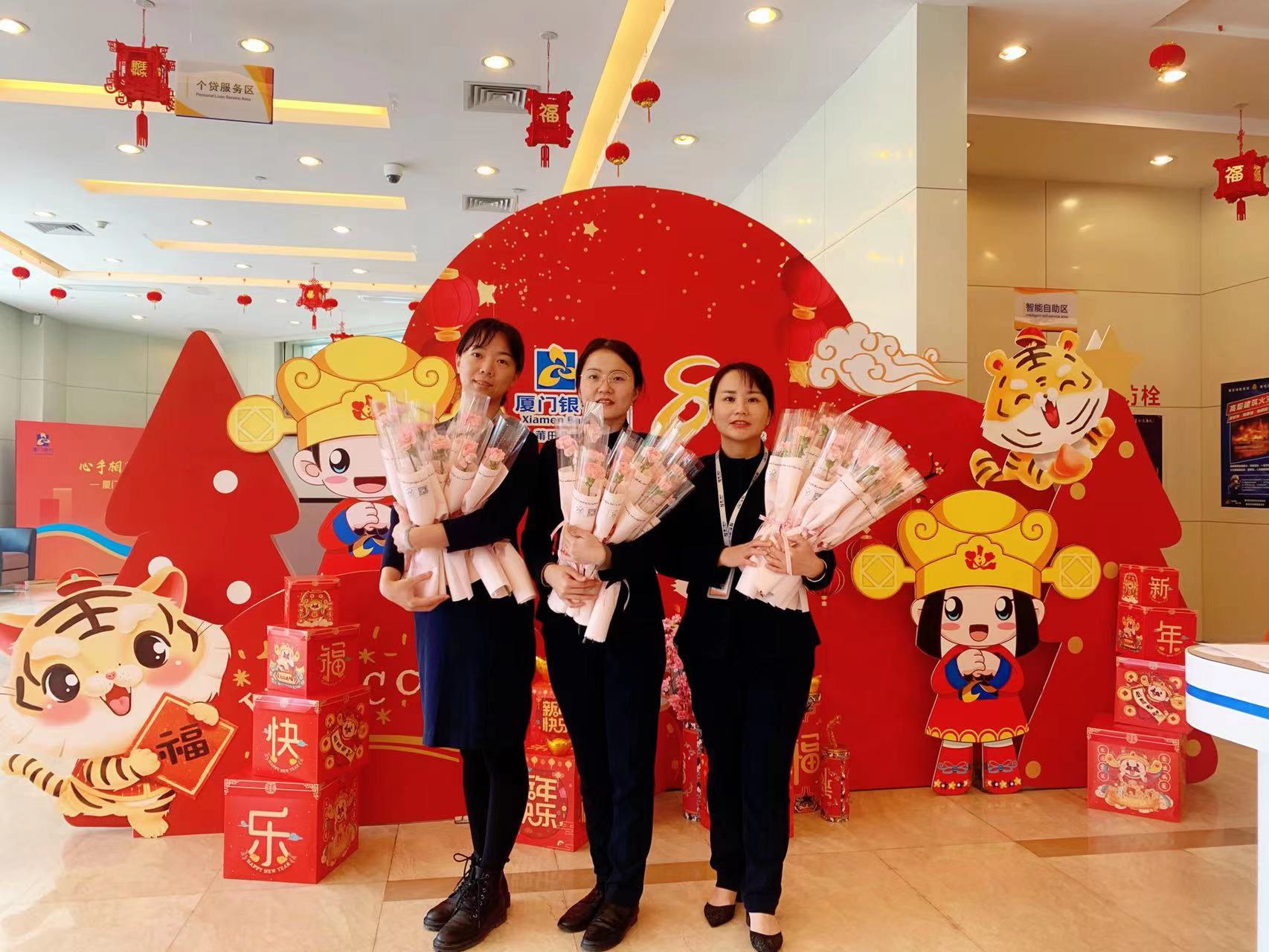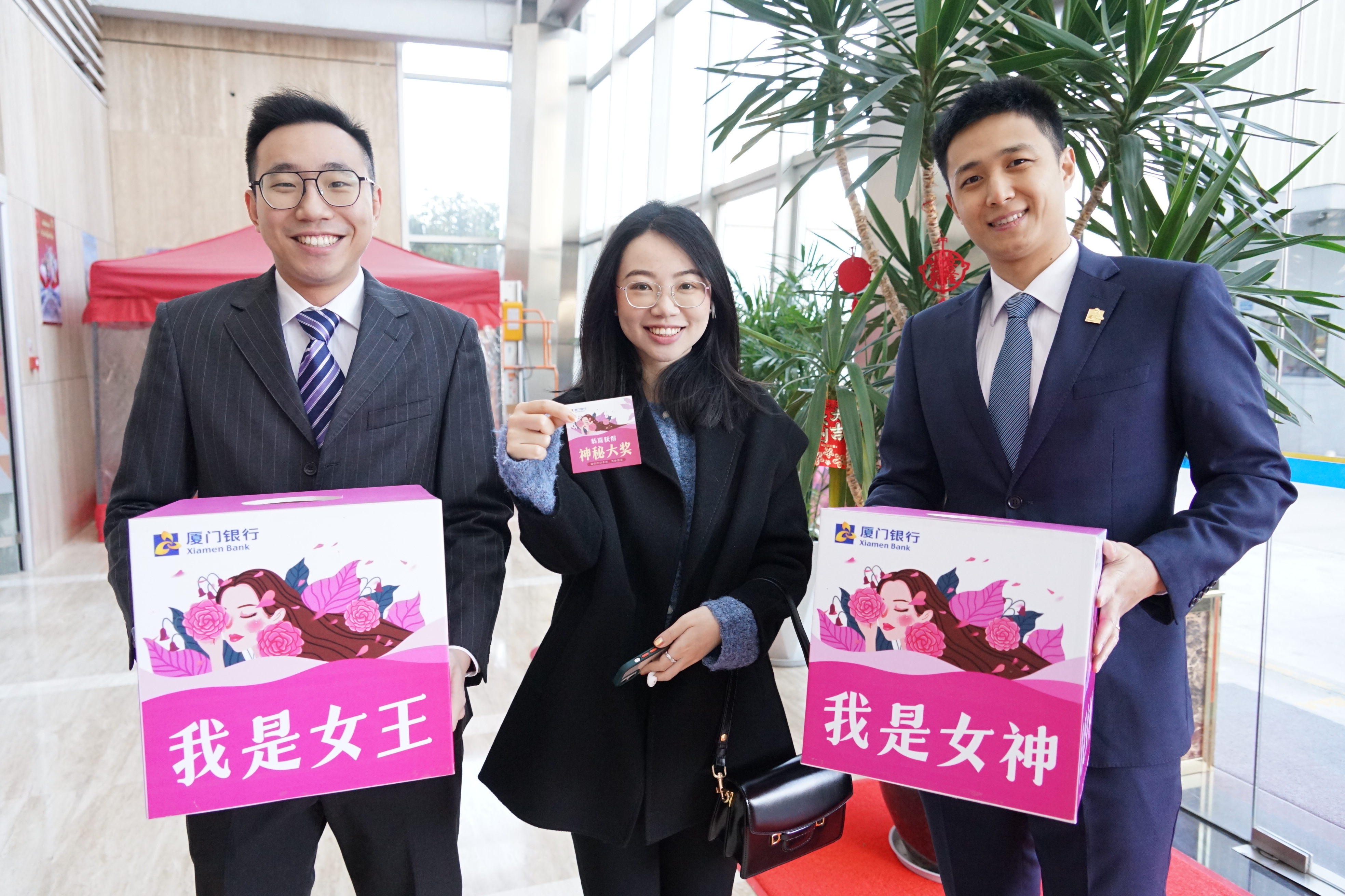 當(dāng)女神們步入廈門(mén)銀行,六個(gè)帥小伙紛紛上前,致以節(jié)日問(wèn)候,并遞上抽獎(jiǎng)箱~考驗(yàn)手氣的時(shí)候到啦!