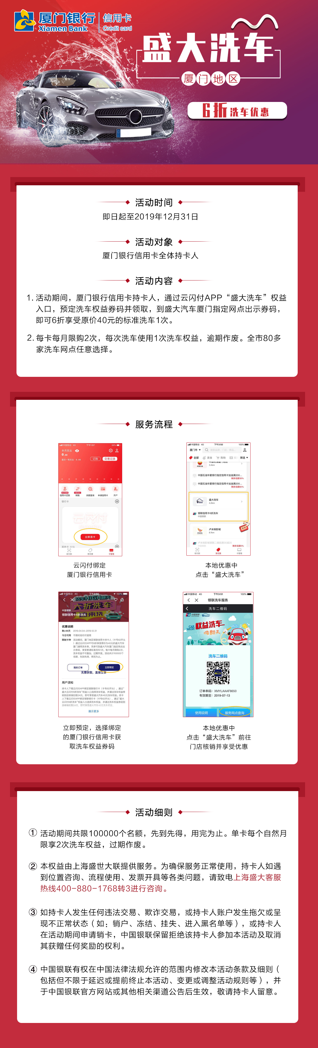 廈門銀行信用卡綁銀聯(lián)云閃付,享盛大洗車6折優(yōu)惠