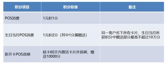 ★ 活動(dòng)說明:1、所贈(zèng)送的積分將于活動(dòng)結(jié)束后30個(gè)自然日內(nèi)充值至持卡人的積分賬戶內(nèi)。2、本活動(dòng)內(nèi)容與信用卡積分規(guī)則中新客戶核卡60天內(nèi)激活卡片并首刷贈(zèng)送10000積分不可同享。3、凡我行2019年09月30日前激活的所有信用卡,均可獲贈(zèng)10000積分獎(jiǎng)勵(lì)。4、我行目前僅支持有效POS刷卡消費(fèi)累計(jì)積分,微信、支付寶等第三方支付方式的消費(fèi)暫不計(jì)入積分。