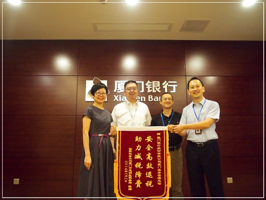 2019年8月15日下午,廈門銀行廈門業(yè)務(wù)管理總部收到了一面很有意義的錦旗。廈門市稅務(wù)局收規(guī)處副處長(zhǎng)陳向群,思明區(qū)稅務(wù)局副局長(zhǎng)高燕槐及思明區(qū)稅務(wù)局收入核算科、辦公室一行5人特意到我行舉行授旗儀式并送來(lái)感謝信。感謝我行對(duì)“減稅降費(fèi)”工作的大力支持,感謝代理支庫(kù)行開元支行克服退稅量大,加班加點(diǎn),為減稅降費(fèi)政策落地生根,助力思明區(qū)經(jīng)濟(jì)發(fā)展做出了重大貢獻(xiàn)。