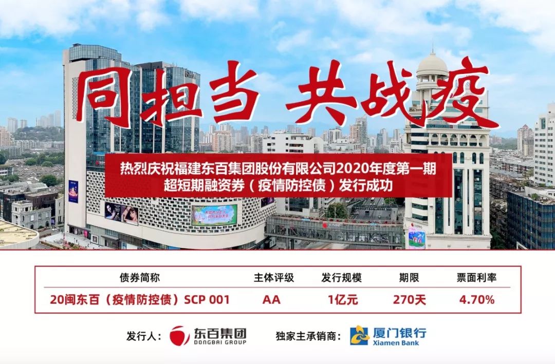 福建東百集團股份有限公司2020年度第一期超短期融資券(疫情防控債)于2020年2月18日成功簿記發(fā)行,票面利率4.7%,創(chuàng)企業(yè)發(fā)行票面利率新低。