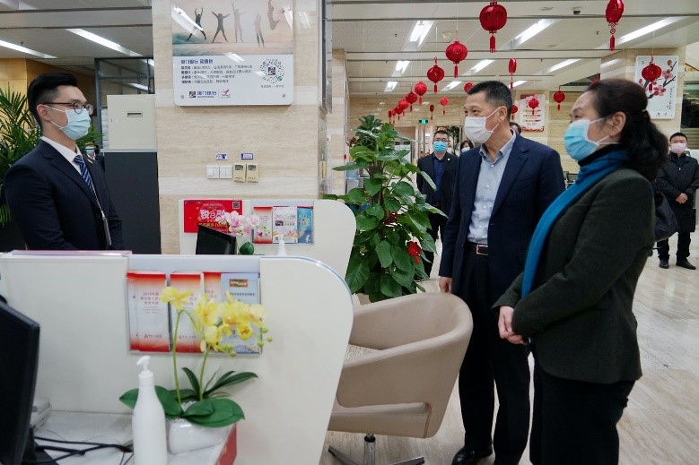 王主任一行經(jīng)過紅外線智能體溫檢測、使用免洗洗手液進(jìn)行手部消毒后,對我行的防疫設(shè)施給予肯定。隨后,王主任一行在吳世群董事長的陪同下來到總行營業(yè)部,并對客戶進(jìn)入銀行營業(yè)廳的流程做了了解。
