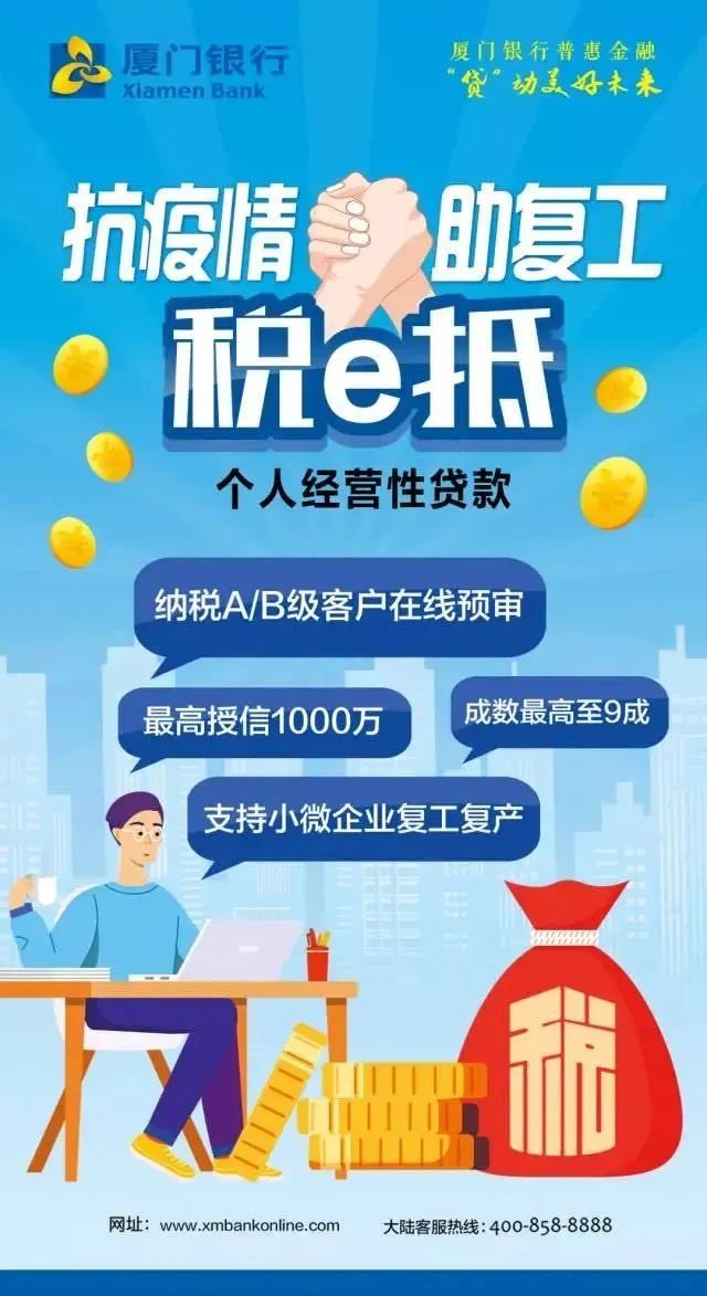 自疫情防控工作開展以來,廈門銀行響應(yīng)國家政策,積極做好企業(yè)金融服務(wù)保障,全力支持企業(yè)復(fù)工復(fù)產(chǎn)、踐行普惠金融。2020年2月,廈門銀行深化落實(shí)“銀稅合作”,金融服務(wù)再升級。在稅貸的基礎(chǔ)上,結(jié)合企業(yè)稅務(wù)信息,精準(zhǔn)定位納稅A/B級企業(yè),全新推出個人經(jīng)營性抵押貸款產(chǎn)品——“稅e抵”。