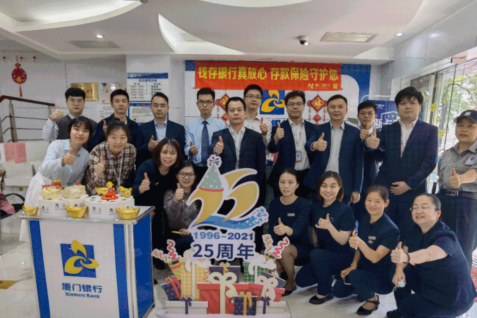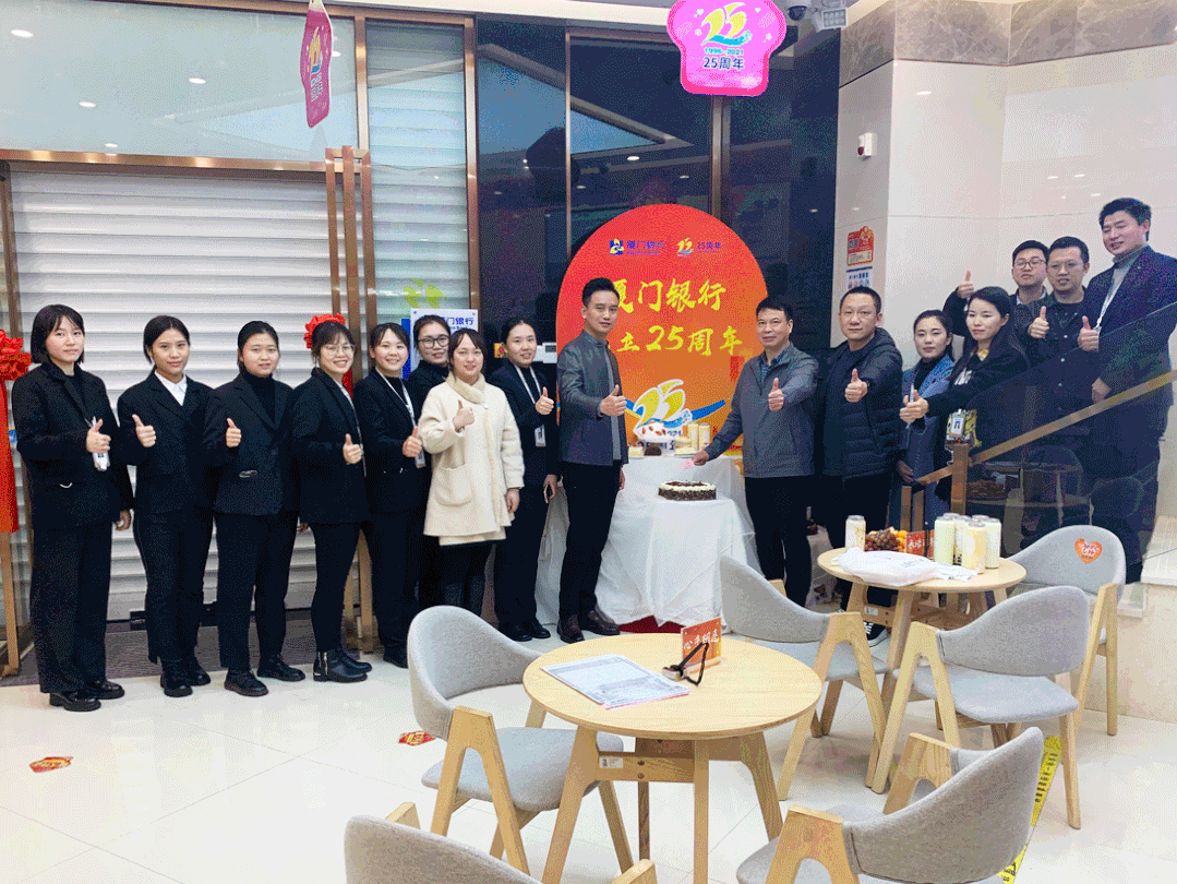 三明地區(qū)各網(wǎng)點為慶祝廈門銀行25周歲生日,不僅將營業(yè)廳布置的氛圍濃厚,分行領(lǐng)導(dǎo)還和大家一起切蛋糕、送祝福,讓喜悅和甜蜜在每個人心中傳遞。